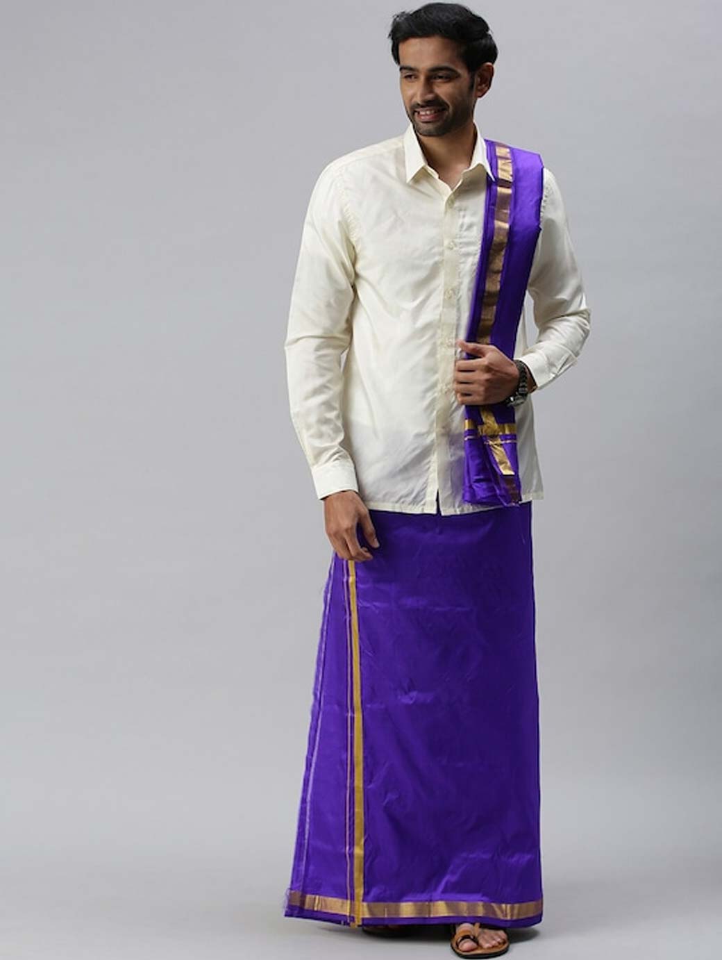 Blue solid mid-rise dhoti, has gold-coloured border Features: Silk Mark Certified Product