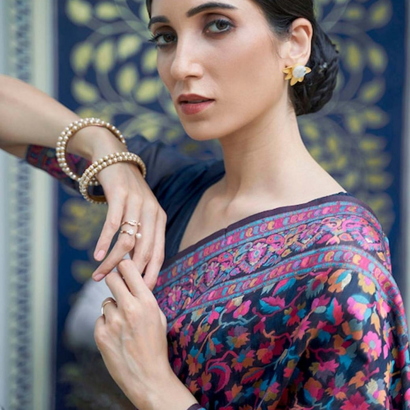 Navy Blue & Pink Floral Zari Silk Blend Banarasi Saree